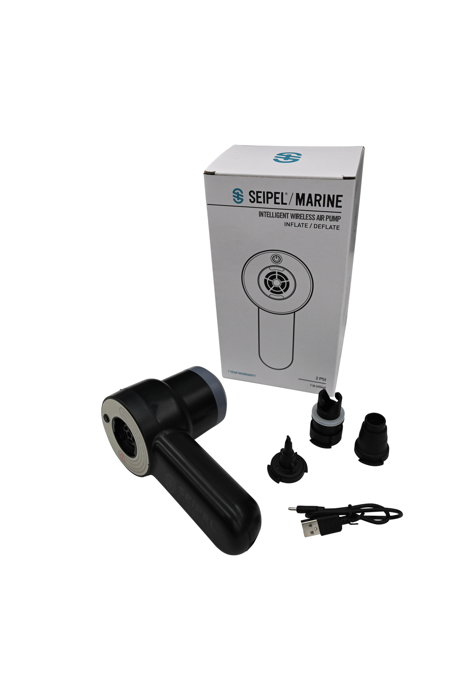 The new Seipel Marine handheld air pump makes filling/emptying all inflatables extremely user-friendly and convenient. It is rechargeable with a USB cable included with the pump. Works on inflatables, Boston valves, Halkey Roberts fittings, tubes, and more.